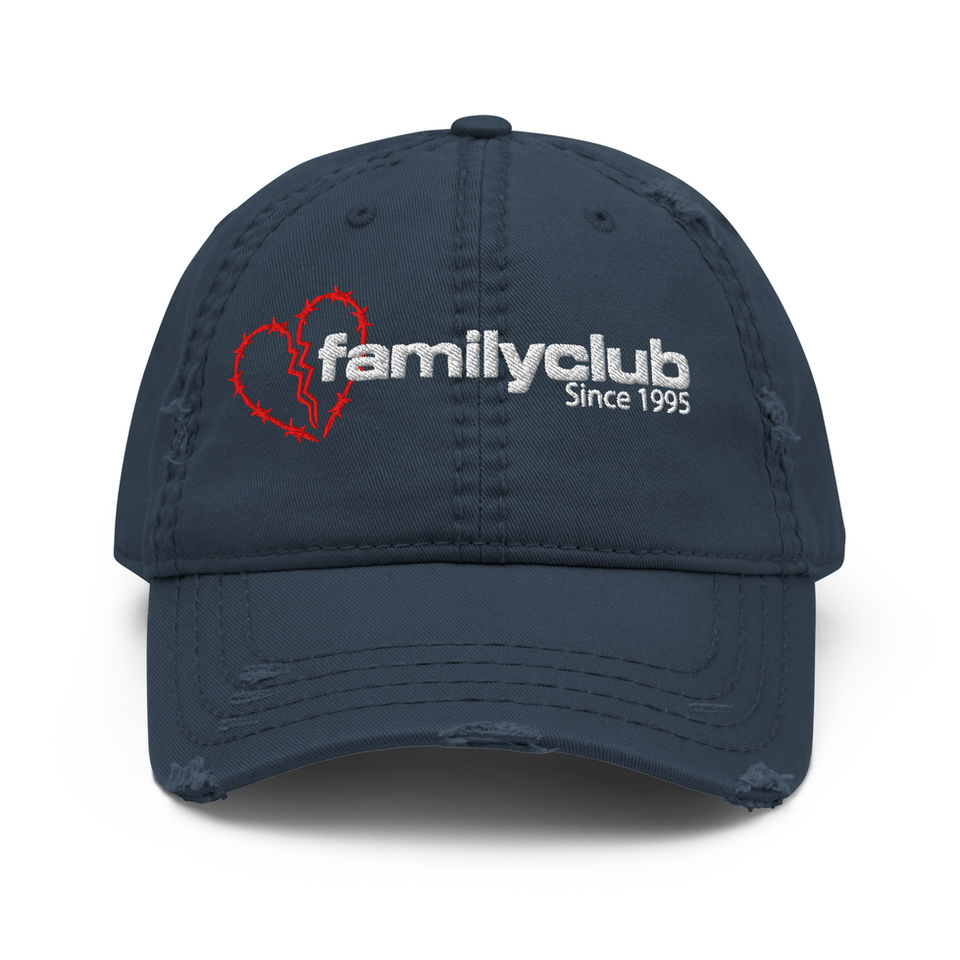 Añade un toque exclusivo a tu look con esta gorra de estilo vintage y urbano. Su diseño desgastado y su bordado 3D en relieve resaltan el icónico logo de Family Club junto a un corazón roto de alambre de espino, dándole un acabado premium. Ideal para festivales, streetwear o el día a día.